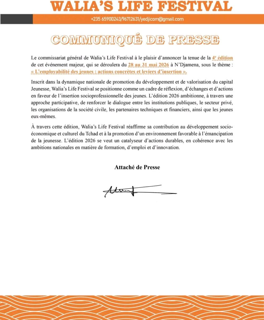 À travers un communiqué de presse rendu public ce 6 décembre 2025, Walia’s Life Festival annonce la tenue de sa 4e édition, prévue du 28 au 31 mai 2026 à Walia, dans le 9e arrondissement de N’Djamena.