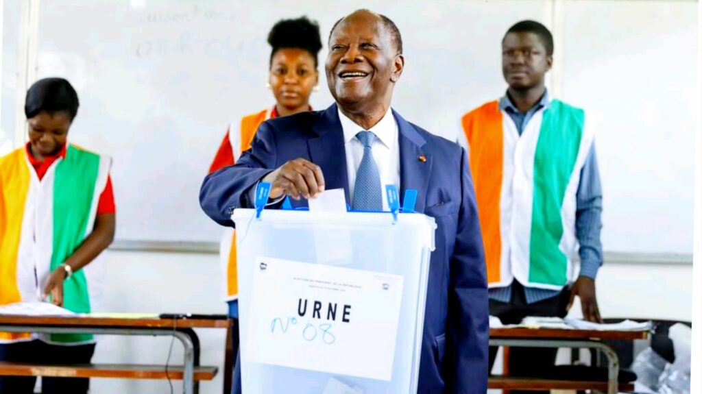 Le président ivoirien Alassane Ouattara a été réélu pour un quatrième mandat sur le score écrasant de 89,77% au premier tour, dans un scrutin privé des deux principales figures de l’opposition, selon les résultats provisoires proclamés lundi 27 octobre par la Commission électorale indépendante (CEI).