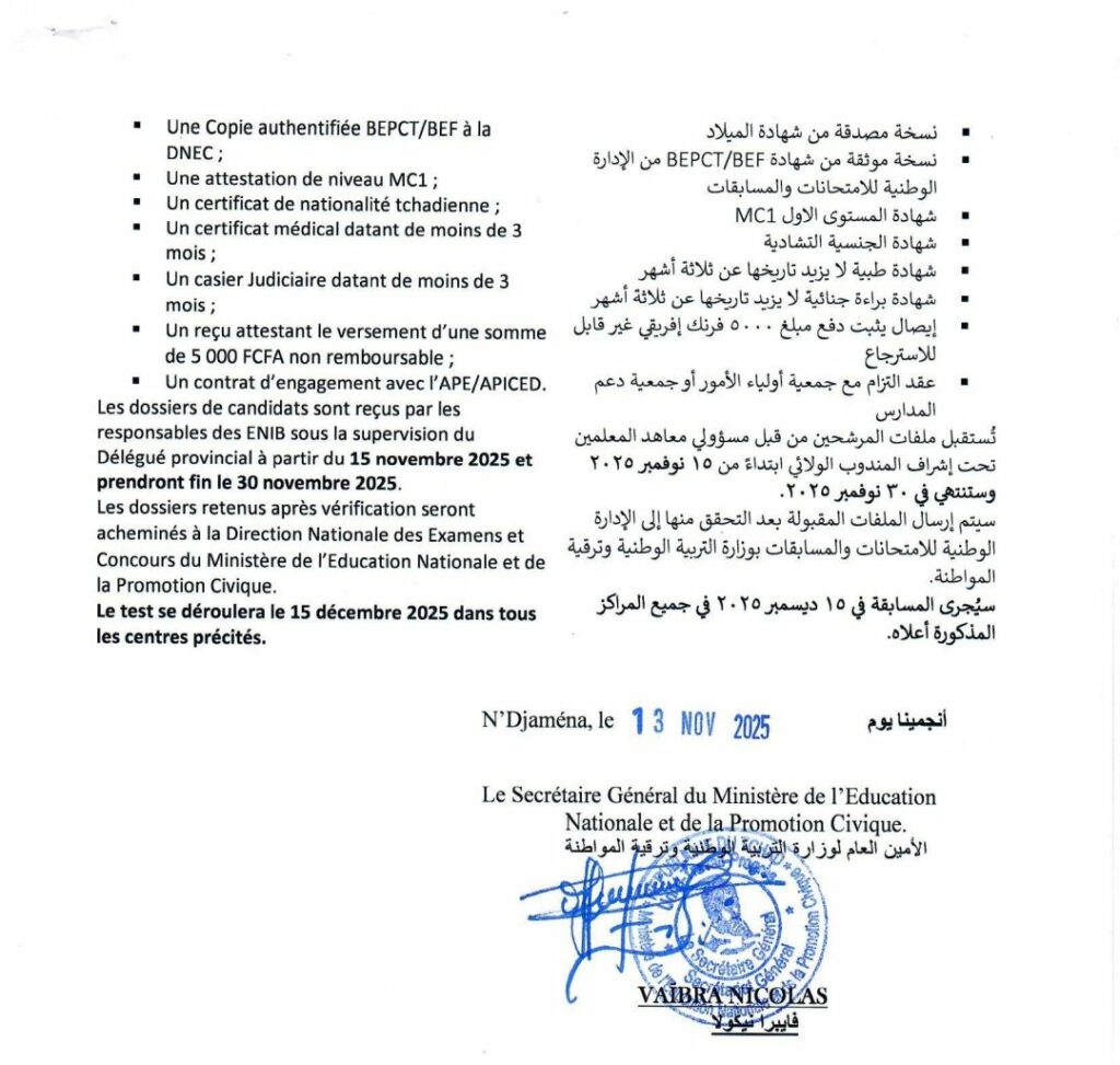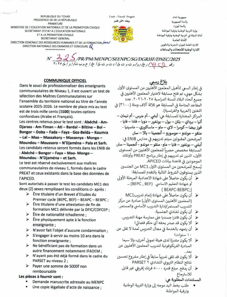 L’objectif de cette sélection est de professionnaliser des enseignants communautaires de Niveau 1. Le nombre de place mis au test est de trois mille cents toutes options confondues (Arabe et Français). Les centres retenus pour le test sont: Abéché, Am-Djarass, Am-Timan, Ati, Bardaï, Biltine, Bol, Bongor, Doba, Fada Faya, Goz-Beïda, Koumra, Laï, Mao, Massakory, Massenya, Mongo, Moundou, Moussoro, N’Djaména, Pala et Sarh. Les candidats retenus seront formés dans les Écoles Nationales d’Institutions Bilingues (ENIB) de : Abéché, Bongor, Faya, Mao, Mongo, Moundou, N’Djaména et Sarh.