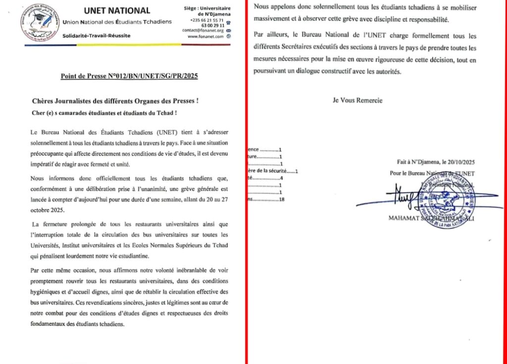 Le bureau national de l’Union des Étudiants tchadiens (UNET) a annoncé, ce 20 octobre 2025, le lancement d’une grève générale dans toutes les universités et écoles supérieures du pays. L’action, qui s’étendra jusqu’au 27 octobre, vise à protester contre la fermeture prolongée des restaurants universitaires et l’arrêt complet des bus de transport estudiantin, sources majeures de perturbation pour la vie académique.